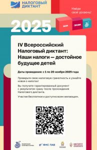 Приглашаем Вас принять участие в Налоговом диктанте. В целях повышения налоговой культуры и грамотности населения, ФНС России и Российская академия народного хозяйства и государственной службы при Президенте Российской Федерации (далее — РАНХиГС) с 1 по 20 ноября 2025 года проводят IV Всероссийский Налоговый диктант «Наши налоги — достойное будущее детей» (далее — Налоговый диктант).