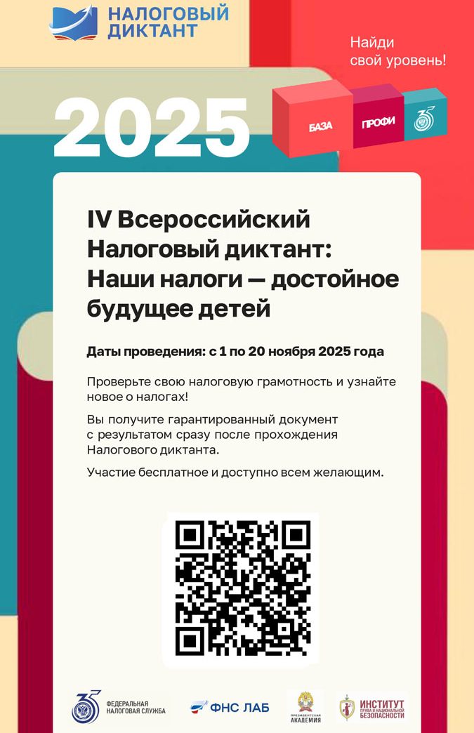 Приглашаем Вас принять участие в Налоговом диктанте. В целях повышения налоговой культуры и грамотности населения, ФНС России и Российская академия народного хозяйства и государственной службы при Президенте Российской Федерации (далее — РАНХиГС) с 1 по 20 ноября 2025 года проводят IV Всероссийский Налоговый диктант «Наши налоги — достойное будущее детей» (далее — Налоговый диктант).